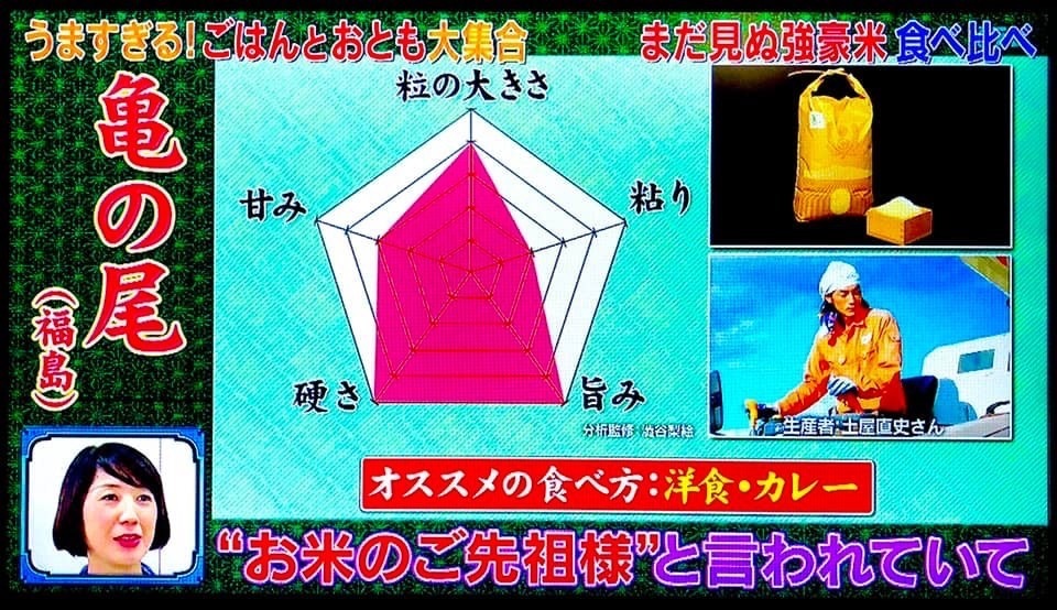 HOME お米の直売所 Eat & Buy Award & Media YouTube お問い合わせ メディアアーカイブ フジテレビ「石橋貴明のタイムトンネル うますぎるニッポンの米 」(2019) つちや農園亀の尾が紹介されました。